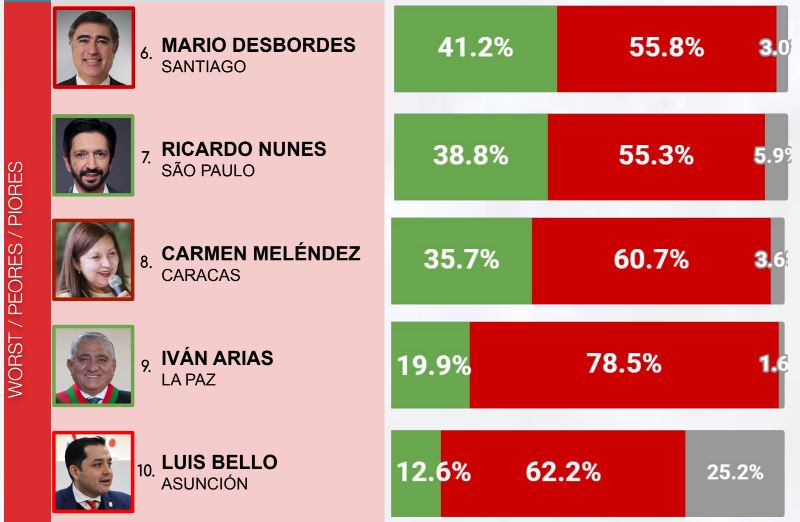 En contraste, los peores calificados son Luis Bello, de Asunción, quien ocupa el último lugar con apenas 12,6% de aprobación; Iván Arias, de La Paz, con 19,9%; y Carmen Meléndez, de Caracas, con 35,7%.