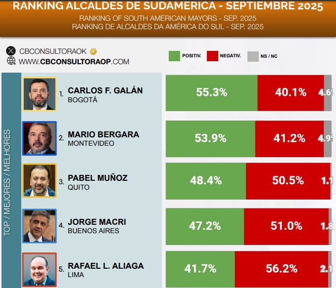 El informe, que evalúa el desempeño de los principales alcaldes de capitales sudamericanas, sitúa en el primer lugar del ranking de aprobación al alcalde de Bogotá, Carlos Fernando Galán, con un 55,3% de imagen positiva. Le siguen Mario Bergara, de Montevideo (53,9%), y Pabel Muñoz, de Quito (48,4%), quienes lideran la lista como los mejor evaluados por sus ciudadanos.
