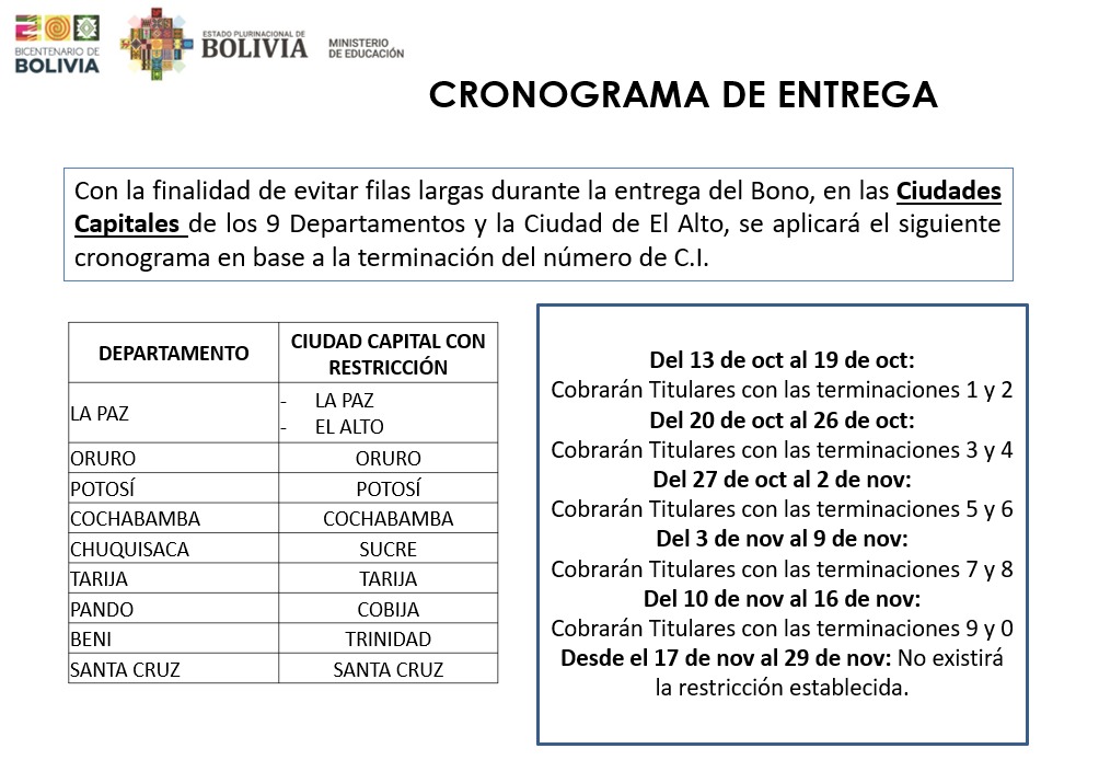 “Con la finalidad de evitar filas largas durante la entrega del bono, en las ciudades capitales de los nueve departamentos y la ciudad de El Alto, se aplicará el cronograma en base a la terminación del número de carnet de identidad”, señala el comunicado del Ministerio de Educación.