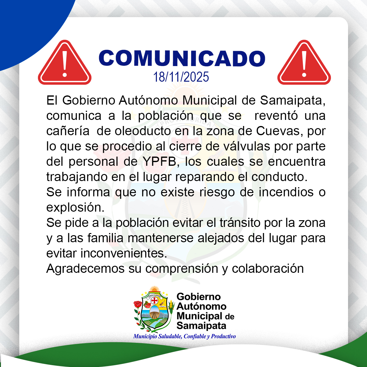 En un comunicado, el Gobierno Autónomo Municipal de Samaipata informó que personal de YPFB cerró las válvulas y afirmó que no existe riesgo de incendios o explosiones.