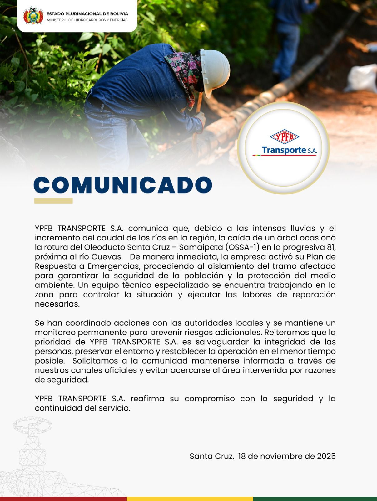“Debido a las intensas lluvias y el incremento del caudal de los ríos en la región, la caída de un árbol ocasionó la rotura del Oleoducto Santa Cruz - Samaipata (OSSA-1) en la progresiva 81, próxima al río Cuevas”, señala un comunicado de YPFB Transporte S.A.
