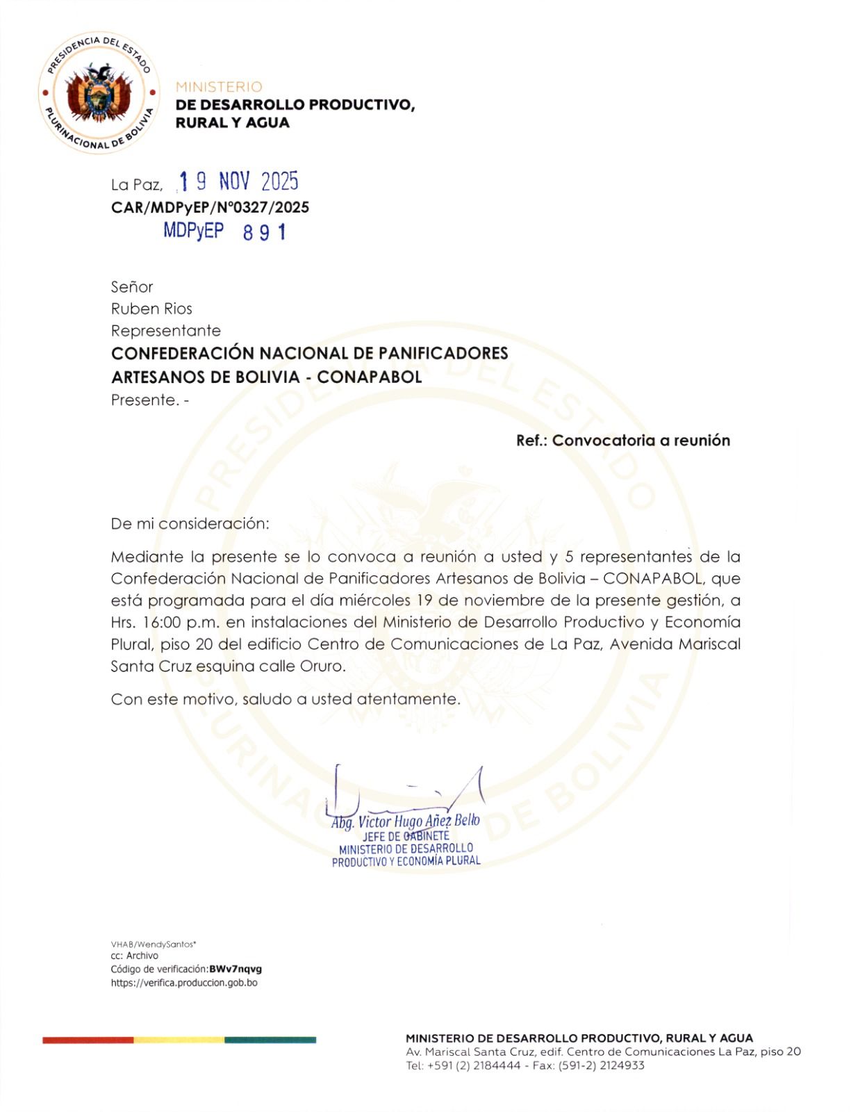 El Ministerio de Desarrollo Productivo, Rural y Agua envió una nota al secretario ejecutivo de la Confederación Nacional de Panificadores Artesanos de Bolivia (Conapabol), Rubén Ríos, para convocarlo a una reunión la tarde de este miércoles en La Paz.