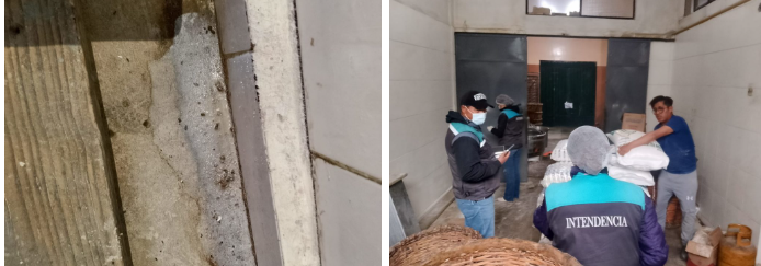 Heces de roedores (izq.) y funcionarios municipales en el horno de Ríos (der.). Fotos: AMUN