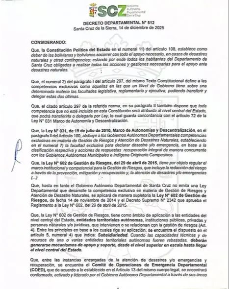 La declaratoria establece que la medida se asume porque el Gobierno Autónomo Departamental de Santa Cruz se encuentra sobrepasado en su capacidad técnica, operativa y financiera para atender la emergencia.