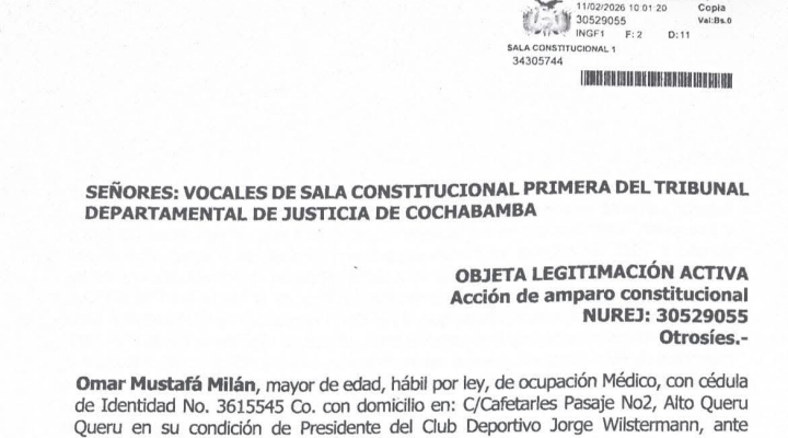 Ante ello, el club, con la firma de su presidente Omar Mustafá, decidió presentar un memorial dirigido a los vocales de la Sala Constitucional Primera del Tribunal Departamental de Justicia de Cochabamba objetando la “legitimación activa” de dicho amparo.