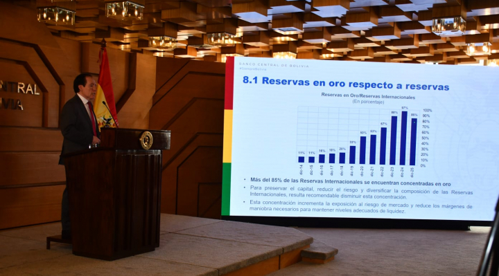 Mendoza indicó que Bolivia cerró la gestión 2025 con 3.713 millones de dólares en reservas internacionales, de las cuales el 85% corresponde a oro, equivalente a 22,3 toneladas.
