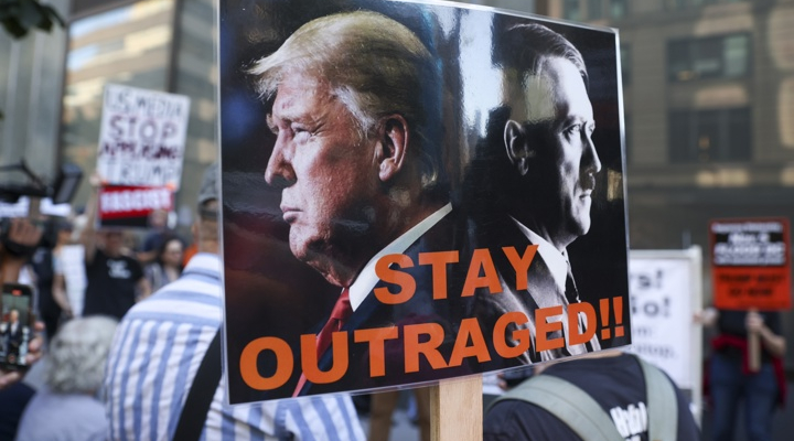 Cink sostenía una pancarta que decía: “Señales peligrosas de fascismo”. Formaba parte del grupo de unas 20 personas que protestó durante varias horas en el lugar, como parte de las reacciones de indignación provocadas por el retiro del popular programa del comediante, conocido por su humor y sátira política.