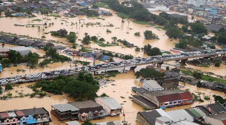 En Hat Yai, ciudad declarada zona de desastre esta semana, tras precipitaciones récord en 300 años, el agua alcanza hasta la segunda planta de algunas viviendas y sus residentes se refugian en el tejado a la espera de ser evacuados, muestran imágenes aéreas del departamento de Relaciones Públicas de Tailandia.