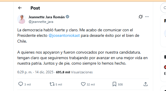 "La democracia habló fuerte y claro. Me acabo de comunicar con el Presidente electo José Antonio Kast para desearle éxito por el bien de Chile", señaló en redes sociales la candidata del progresismo que, al frente de la coalición más amplia de la historia en Chile.