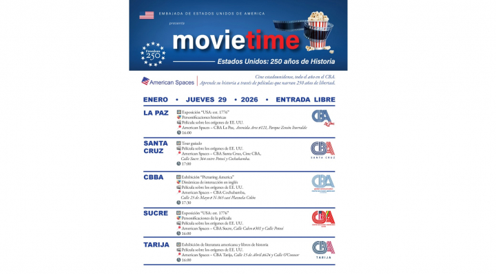 El programa inaugural del 29 de enero será gratuito y abierto a todo el público, con actividades simultáneas en cinco ciudades del país. Entre las propuestas centrales destaca la exposición fotográfica “USA: est. 1776”, que se presentará en La Paz y Sucre. Las imágenes recorren episodios clave de la historia estadounidense, así como los valores que han marcado su desarrollo como nación. A ello, se suman proyecciones de una película estadounidense en La Paz, Santa Cruz, Cochabamba, Sucre y Tarija, dedicada a explorar los orígenes históricos y los ideales fundacionales de libertad.