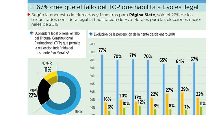 El 67% de los consultados de la encuesta, que Mercados y Muestras elaboró para Página Siete, considera que es ilegal el fallo del Tribunal Constitucional Plurinacional (TCP) que habilita al presidente Evo Morales para postularse de manera indefinida a la presidencia.