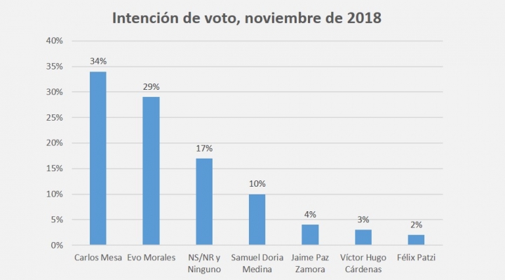 La encuesta, publicada por Página Siete, muestra un aumento en el respaldo a Mesa de 33% a 34% con respecto al estudio de octubre y el descenso de Morales, del 31% al 29%.