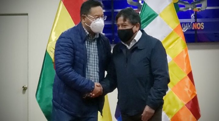 El presidente Luis Arce cuando deja el mando al vicepresidente David Choquehuanca. Foto: Min. de la Presidencia