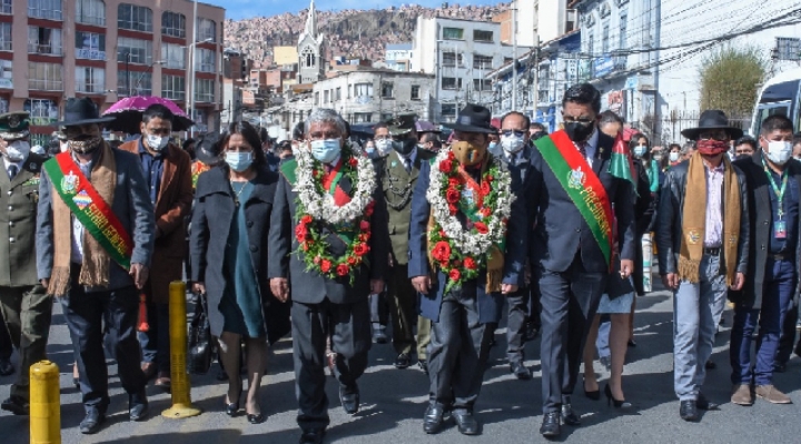 Arias, acompañado de Quispe, lideró este miércoles el primer desfile cívico organizado por la Gobernación de La Paz en homenaje a los 473 años de fundación de la urbe paceña, que no se acostumbraba realizar el 20 de octubre y cuyo palco central fue instalado a la altura de la plaza Mayor de San Francisco. “A partir de ahora hemos acordado que se haga cada año”, señaló el titular de la comuna paceña.