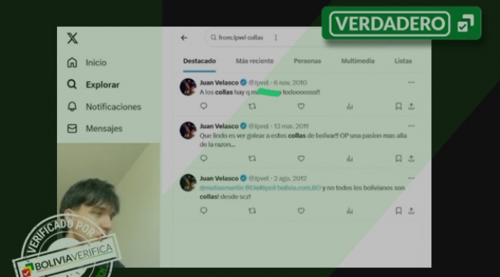 “¡A los collas hay que matarlos a todos!”, escribió un usuario de X, el 6 de noviembre del 2010 a través de la cuenta @Jpvel. Las verificadoras bolivianas confirmaron que la misma fue registrada por el candidato vicepresidencial Velasco ante el TSE.