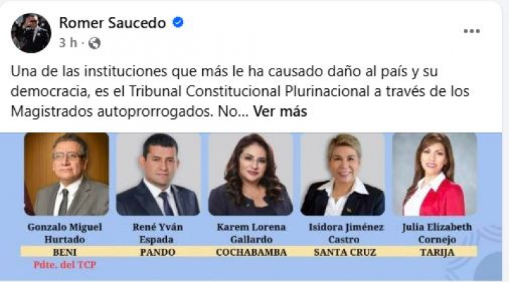 Saucedo, electo magistrado en las elecciones judiciales de 2024, calificó la actuación de los miembros del TCP como una de las más perjudiciales para el Estado. “Una de las instituciones que más daño le ha causado al país y a su democracia es el Tribunal Constitucional Plurinacional, a través de los magistrados autoprorrogados. No podemos permitir que un puñado de personas destruyan la institucionalidad”, advirtió.