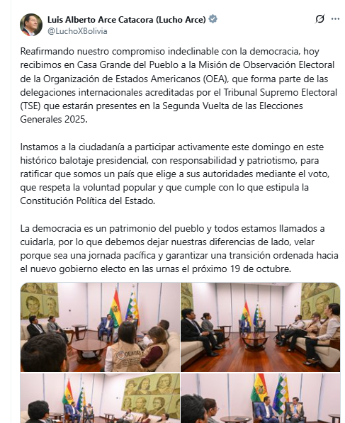 El presidente Arce se reunió el jueves con la misión de observadores de la OEA. Luego publicó un mensaje en su cuenta en la que resaltó la importancia del balotaje de este domingo.