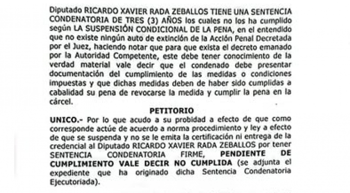 Tras la denuncia en sentido de que Ricardo Rada, diputado electo por el PDC, tendría una sentencia judicial, el vocal electoral Gustavo Ávila dejó abierta la posibilidad de suspender la entrega de credencial a ese legislador elegido