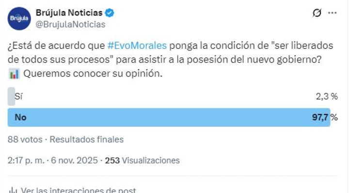 La mayoría de los participantes en el sondeo de opinión de Brújula Digital expresó su desacuerdo con la condición impuesta por el expresidente Evo Morales para asistir a la posesión del nuevo gobierno.