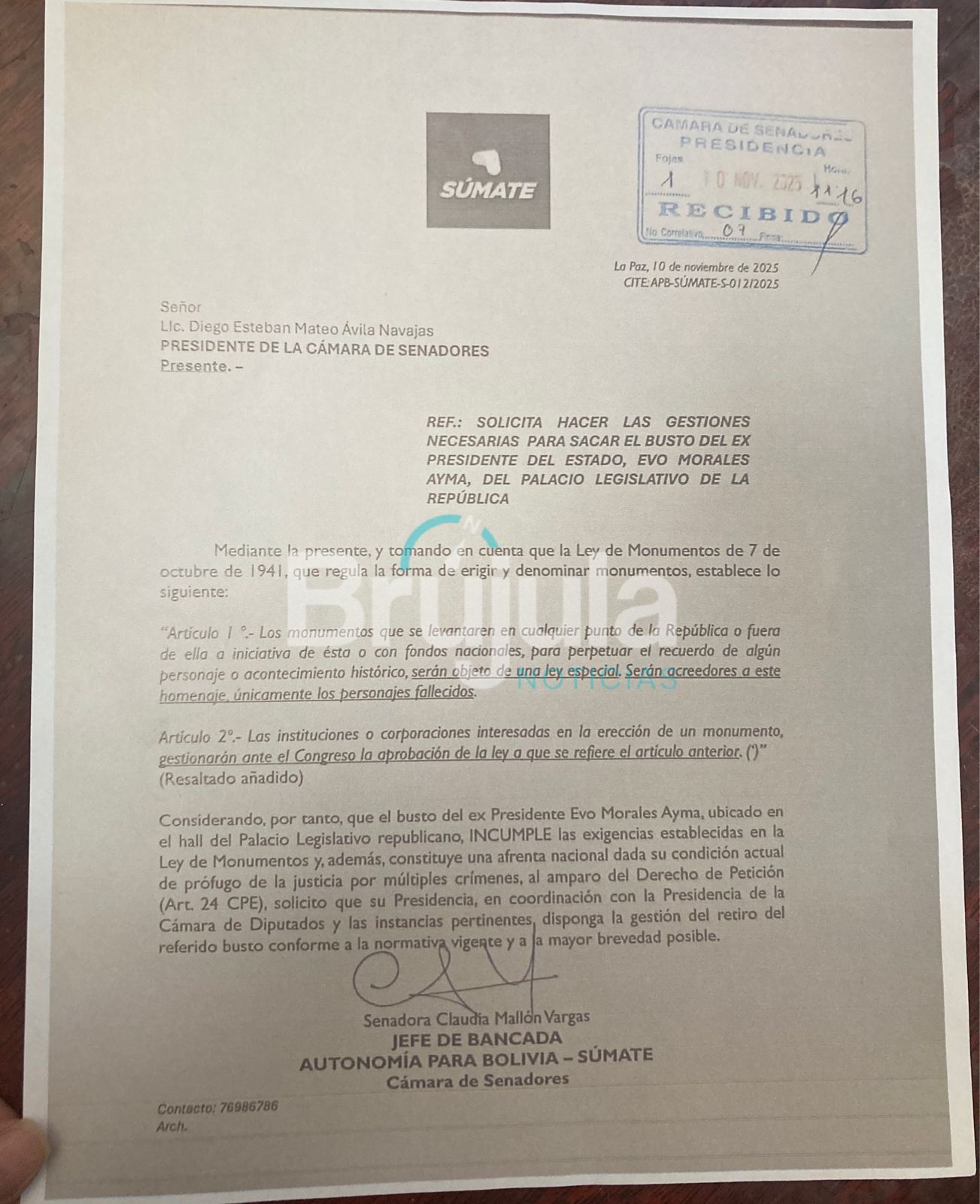 “Considerando, por tanto, que el busto del expresidente Evo Morales, ubicado en el hall del Palacio Legislativo republicano, incumple las exigencias establecidas en la ley de Monumentos y, además, constituye una afrenta nacional dada su condición actual de prófugo de la justicia por múltiples crímenes, solicito a su presidencia en coordinación con la presidencia de Cámara de Diputados y las instancias pertinentes, disponga la gestión del retiro del referido busto conforme a la normativa vigente”, señala la carta enviada por los legisladores.