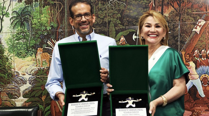 El Comité Cívico de la región oriental de Santa Cruz, entidad que reúne a los líderes civiles del departamento, entregó una plaqueta de reconocimiento a la expresidenta transitoria "por su lucha y sacrificio por la democracia", como parte de la "cruzada por la libertad", proyecta que apuesta a que no haya ni un solo preso político en Bolivia.