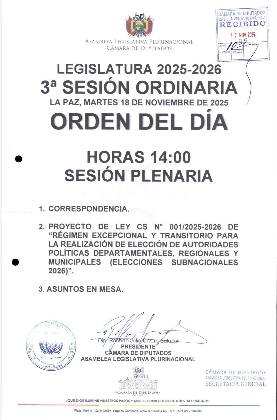 Según el orden del día, se tienen tres puntos en agenda: en el primero está la correspondencia; en el segundo, el proyecto de ley LEY CS N° 001/2025-2026 de "Régimen excepcional y transitorio para la realización de elección de autoridades políticas departamentales, regionales y municipales (Elecciones Subnacionales 2026)"; y por último, asuntos en mesa.