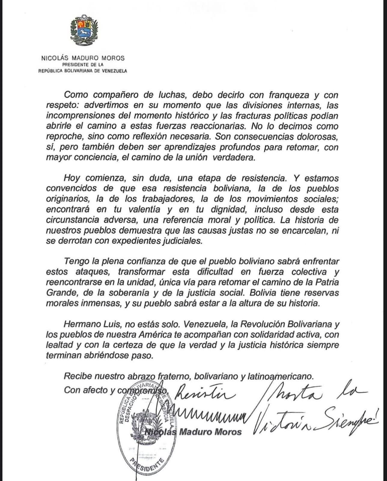 La carta concluye con un mensaje de respaldo a Arce, en el que Maduro asegura que el exgobernante boliviano no está solo y reafirma la solidaridad de Venezuela y de los pueblos de América Latina.