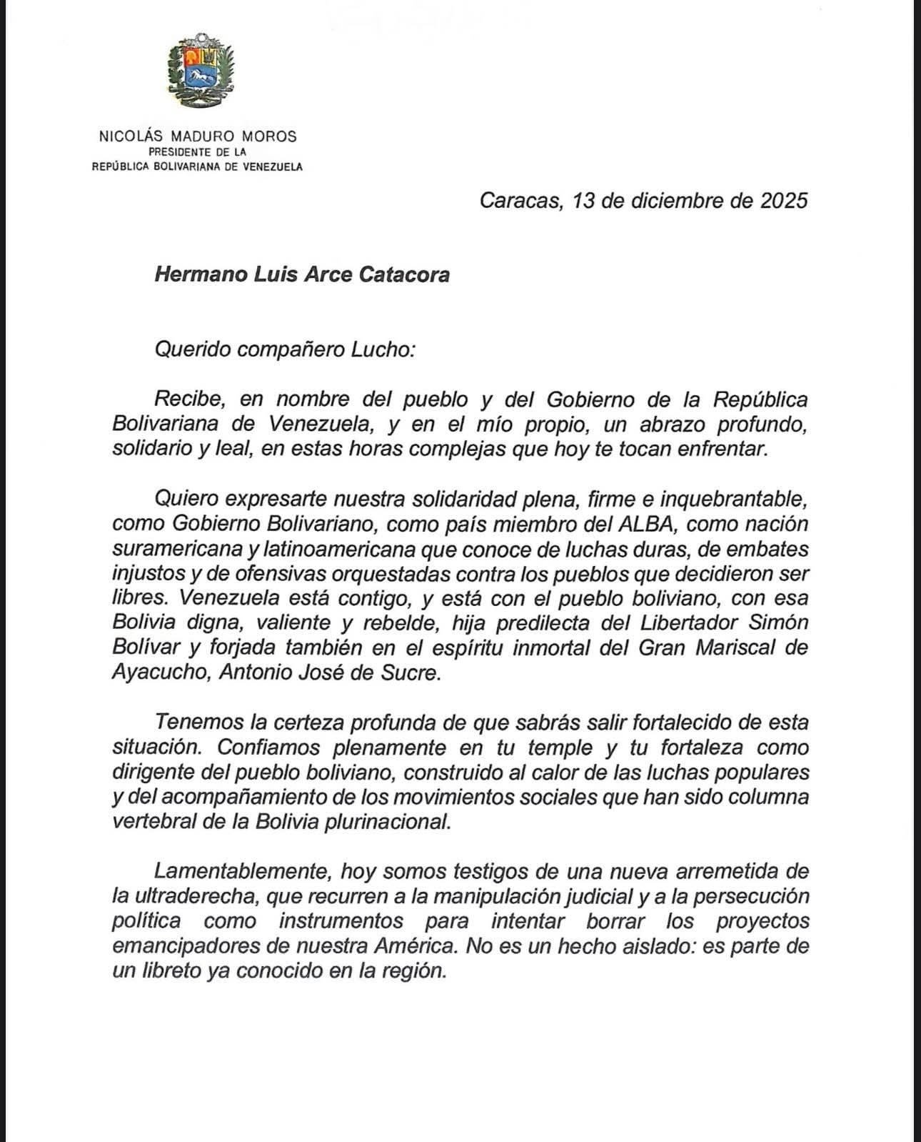 En la misiva, fechada el 13 de diciembre de 2025 en Caracas, Maduro transmite a Arce “un abrazo profundo, solidario y leal” en nombre del pueblo y del Gobierno venezolanos. Asegura además que su país acompaña a los bolivianos en este momento y sostiene que la situación del exmandatario forma parte de una ofensiva regional contra proyectos políticos “emancipadores”.