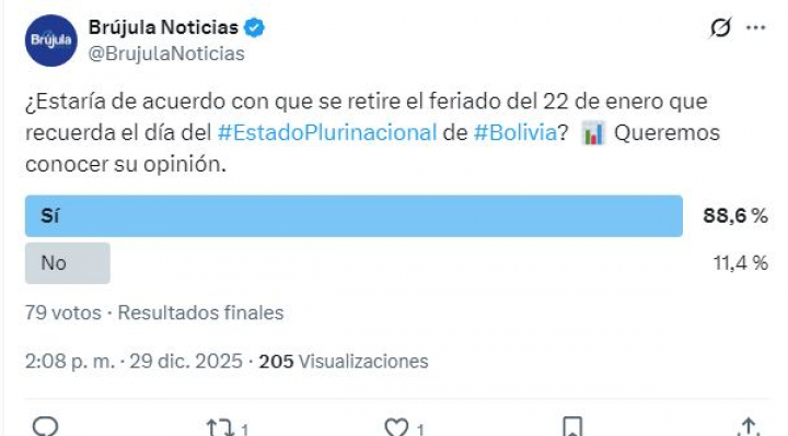 Un sondeo de opinión realizado por Brújula Digital a través de sus redes sociales muestra un amplio respaldo ciudadano a la eliminación del feriado del 22 de enero, fecha que conmemora el Día del Estado Plurinacional de Bolivia, aunque el gobierno ya confirmó que la jornada se mantiene sin cambios.
