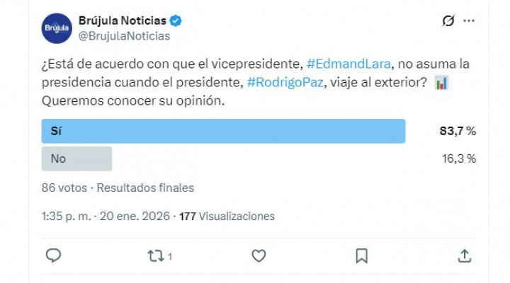 La mayoría de los usuarios que participaron en el sondeo de opinión de Brújula Digital, a través de redes sociales, expresó su acuerdo con que el vicepresidente Edmand Lara no asuma la presidencia cuando el presidente Rodrigo Paz viaje al exterior y continúe ejerciendo funciones mediante herramientas tecnológicas.