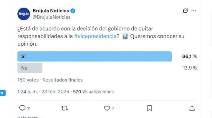 Ante la pregunta: “¿Está de acuerdo con la decisión del gobierno de quitar responsabilidades a la vicepresidencia?”, en Facebook el 85 % respondió que sí, frente a un 15 % que expresó su desacuerdo. En X, el 86 % apoyó la medida y el 14 % se manifestó en contra.