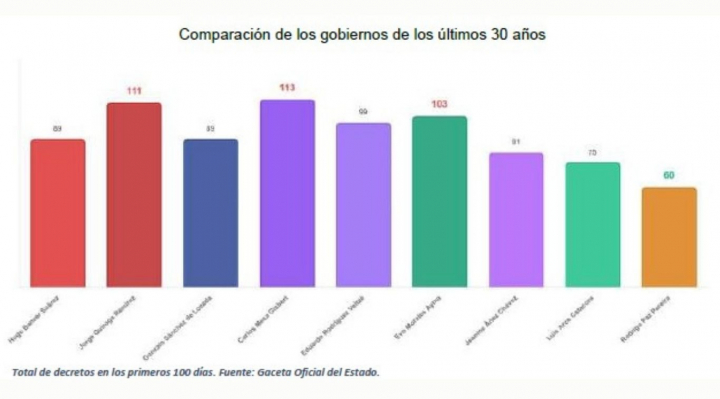 En base a la revisión de la Gaceta Oficial, el informe de Linares coloca al expresidente Carlos Mesa como el jefe de Estado que más utilizó esta herramienta en sus primeros 100 días, con un total de 113 decretos. Le siguen Jorge Quiroga (111), Evo Morales (103) y Víctor Paz Estenssoro (101). Linares hizo notar que la cantidad de normativas aprobadas duplica las del actual gobierno.