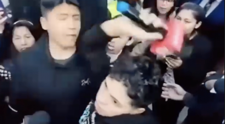 Ríos fue abordado por la prensa tras la audiencia que le otorgó libertad. Estaba por hablar cuando, en medio de gritos y tumulto, tomó el micrófono y lo lanzó con fuerza. Luego, un hombre con gorra que aparentemente lo acompañaba dijo: “Bien tirado, está puñeteando (sic)”.