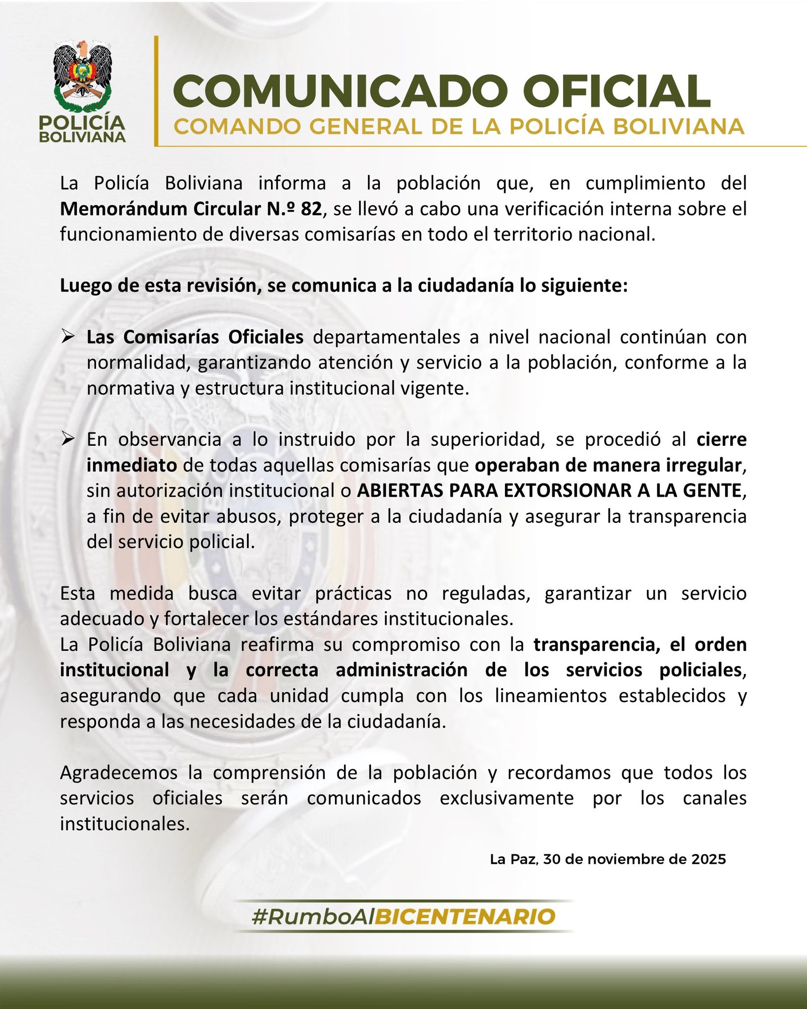 “Se procedió al cierre inmediato de todas aquellas comisarías que operaban de manera irregular, sin autorización institucional o ABIERTAS PARA EXTORSIONAR A LA GENTE, a fin de evitar abusos, proteger a la ciudadanía y asegurar la transparencia del servicio policial”, señala el comunicado.
