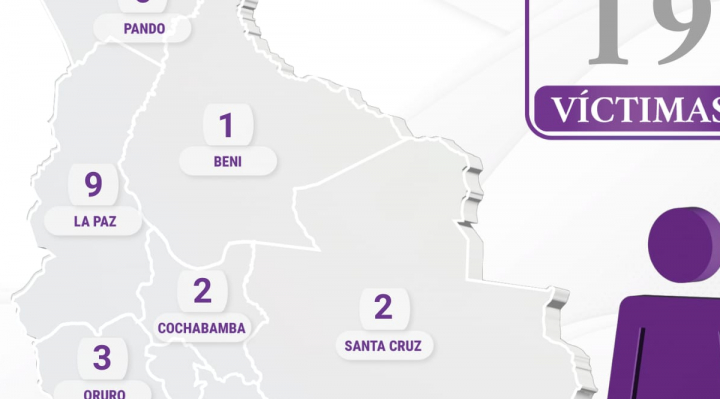 De acuerdo con datos del Ministerio Público, La Paz concentra la mayor cantidad de feminicidios con nueve casos, seguida de Oruro con tres. Santa Cruz y Cochabamba reportan dos cada uno, mientras que Beni, Potosí y Tarija registran un caso. En Pando y Chuquisaca no se reportaron hechos de este tipo.