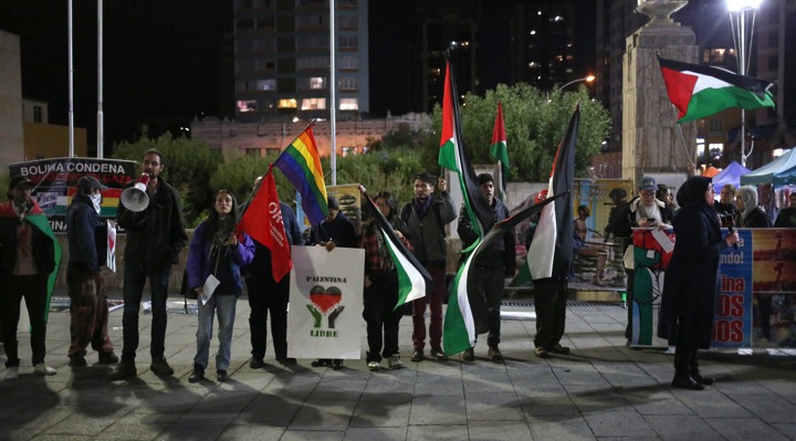Decenas de bolivianos ondearon banderas de Palestina frente a la Universidad Mayor de San Andrés en la ciudad de La Paz y gritaron consignas para pedir un alto a lo que consideraron un "genocidio" de parte de Israel contra el pueblo palestino