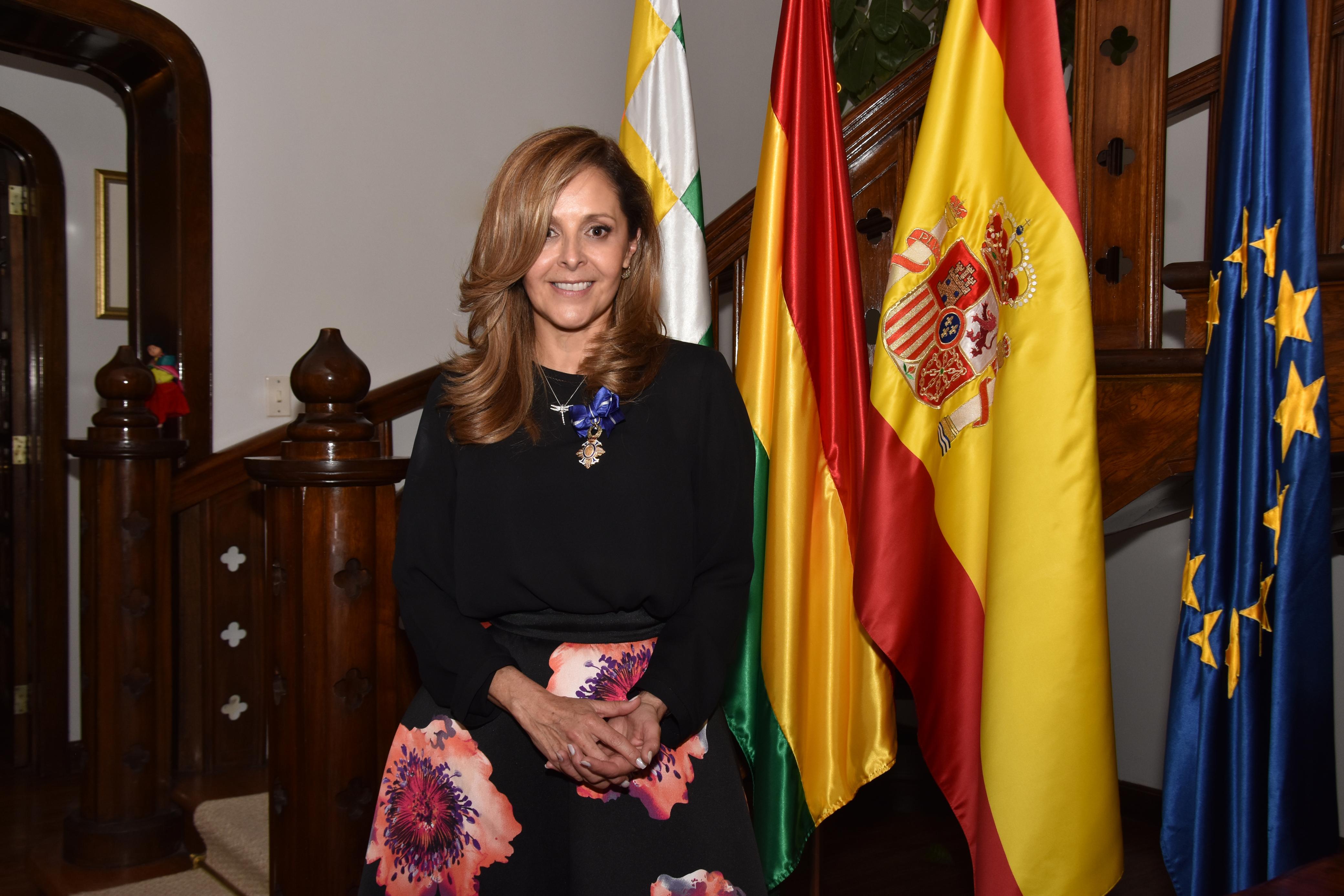 En un acto celebrado en la residencia de la Embajada de España en La Paz, el embajador Fernando García Casas condecoró a la periodista Carla Tejerina con la Cruz de Oficial de la Orden del Mérito Civil, una de las más altas distinciones que concede el Estado español a ciudadanos que han contribuido al fortalecimiento de los lazos entre España y otros países.