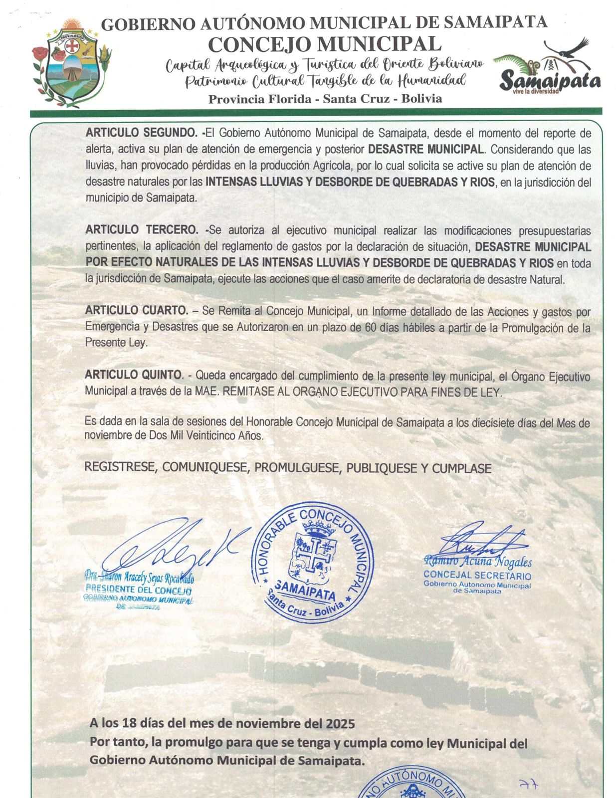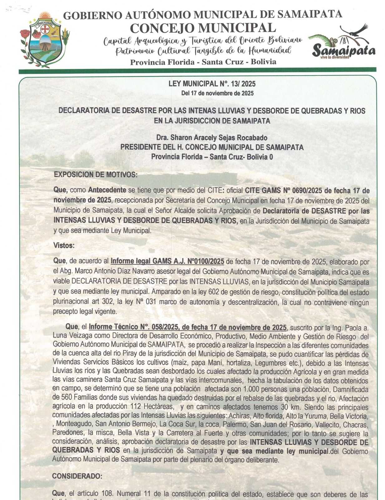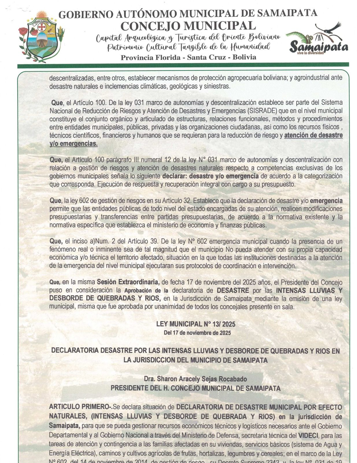 “Se declara situación de DECLARATORIA DE DESASTRE MUNICIPAL POR EFECTO NATURALES, (INTENSAS LLUVIAS Y DESBORDE DE QUEBRADA Y RIOS) en la jurisdicción de Samaipata”, señala el artículo primero de la Ley Municipal N° 13/2025, publicada en la página de Facebook de la Alcaldía.