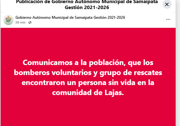 “Comunicamos a la población, que los bomberos voluntarios y grupo de rescates encontraron un persona sin vida en la comunidad de Lajas”, se lee en un comunicado subido por el Gobierno Autónomo Municipal de Samaipata en su cuenta de Facebook.