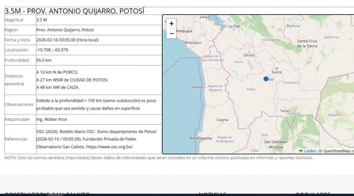 Un sismo de magnitud 3.5 se registró la madrugada de este lunes 16 de febrero en el departamento de Potosí, según un reporte publicado en las redes sociales de la Red Sismológica del Observatorio San Calixto (RS-OSC).