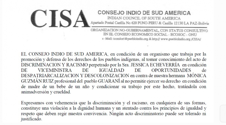 Diversas organizaciones indígenas emitieron pronunciamientos públicos denunciando supuestos actos de discriminación que habría sufrido la socióloga guaraní Mónica Guzmán de parte de la viceministra de Igualdad de Oportunidades y Descolonización, Jessica Echeverría.